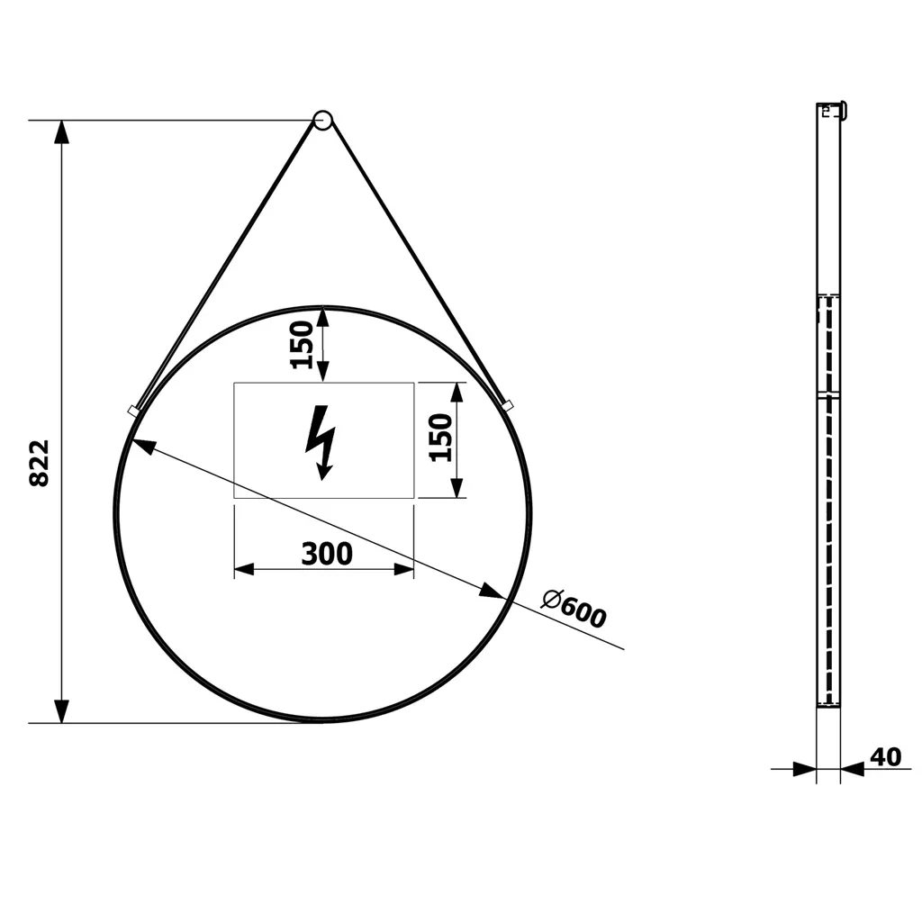 Zrcadlo kulaté s LED osvětlením, průměr 60cm, kožený pásek, černá matná 198411081