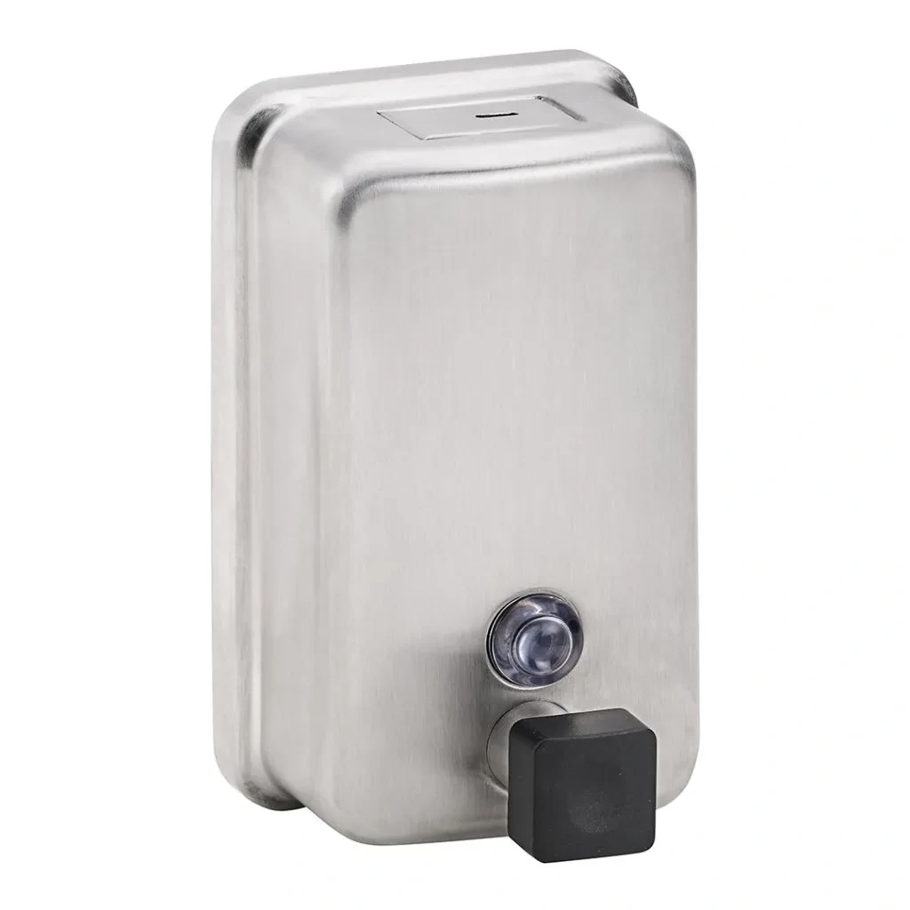 Nerezový dávkovač pro tekuté mýdlo. Dávkovač má ruční ovládání a je určený pro instalaci na zeď.
