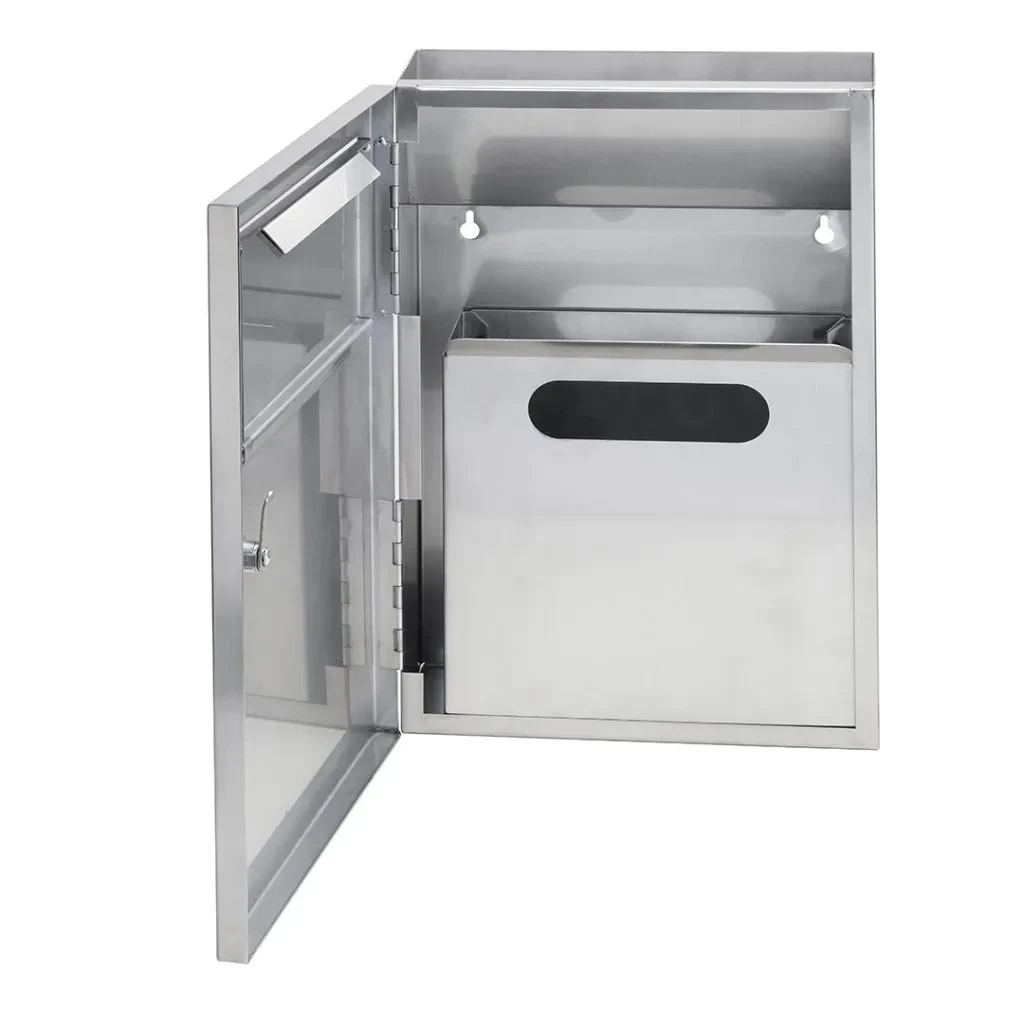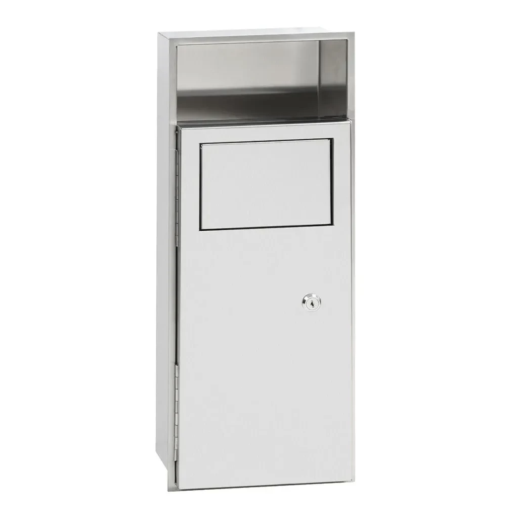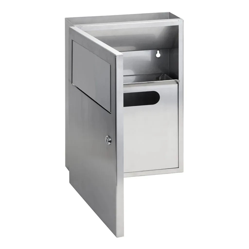 Nerezový odpadkový koš s objemem 4 l s integrovaným zásobníkem hygienických sáčků určený k zabudování do zdi. Skříňka z přední části uzamykatelná. Součástí koše je plastová nádoba uvnitř koše.