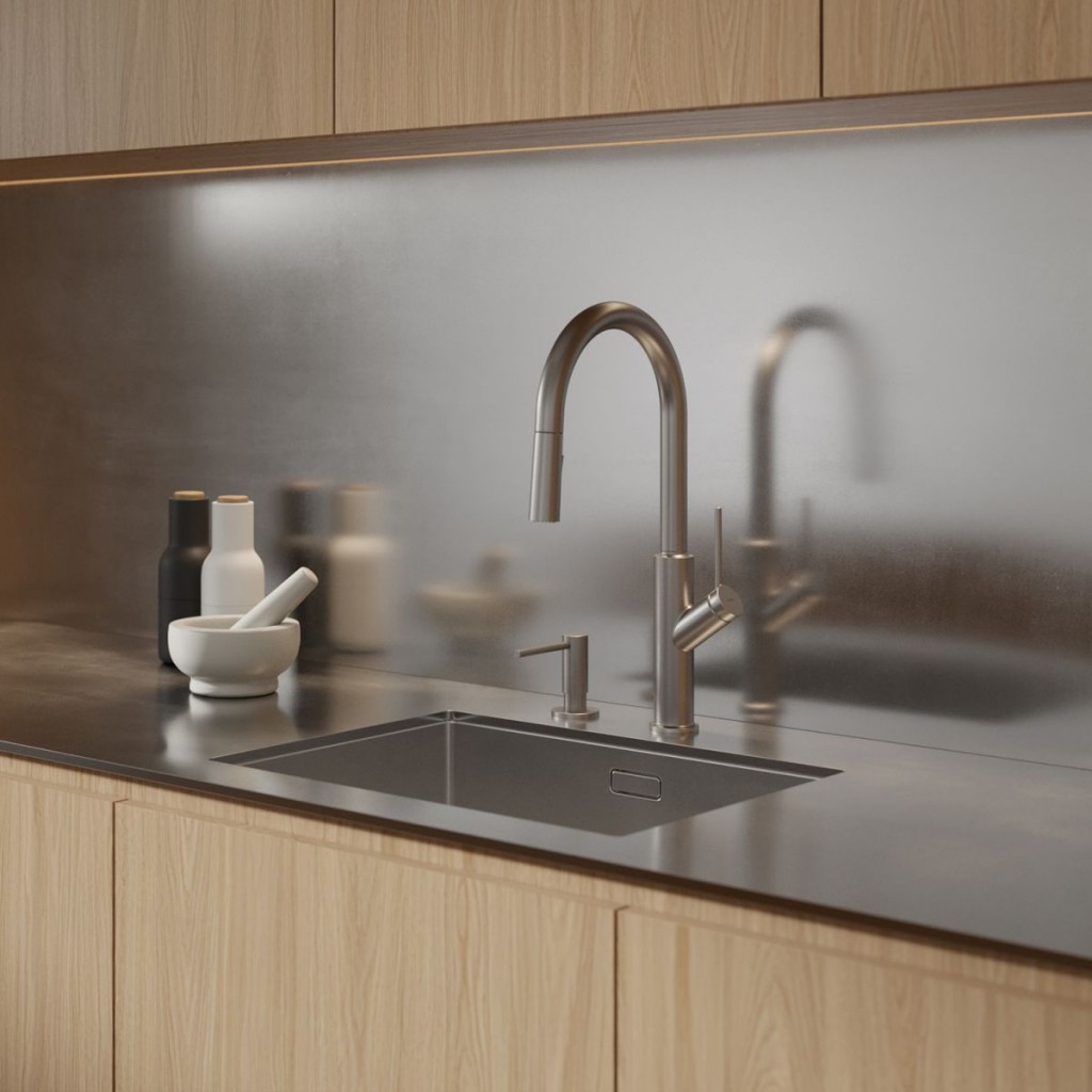 Kuchyňská baterie OMNIRES BEND se vyznačuje krásnou, minimalistickou formou založenou na kruzích a obloucích. Baterie o výšce 44,9 cm je vybavena otočným výsuvným výtokem s 2funkční sprchou, která zvyšuje dosah proudu vody a komfort používání. Baterie je vyrobena z kvalitní mosazi a opatřena nejkvalitnější keramickou kartuší. Inovativní technologická řešení zajišťují nejvyšší komfort používání a snižují spotřebu vody na polovinu.