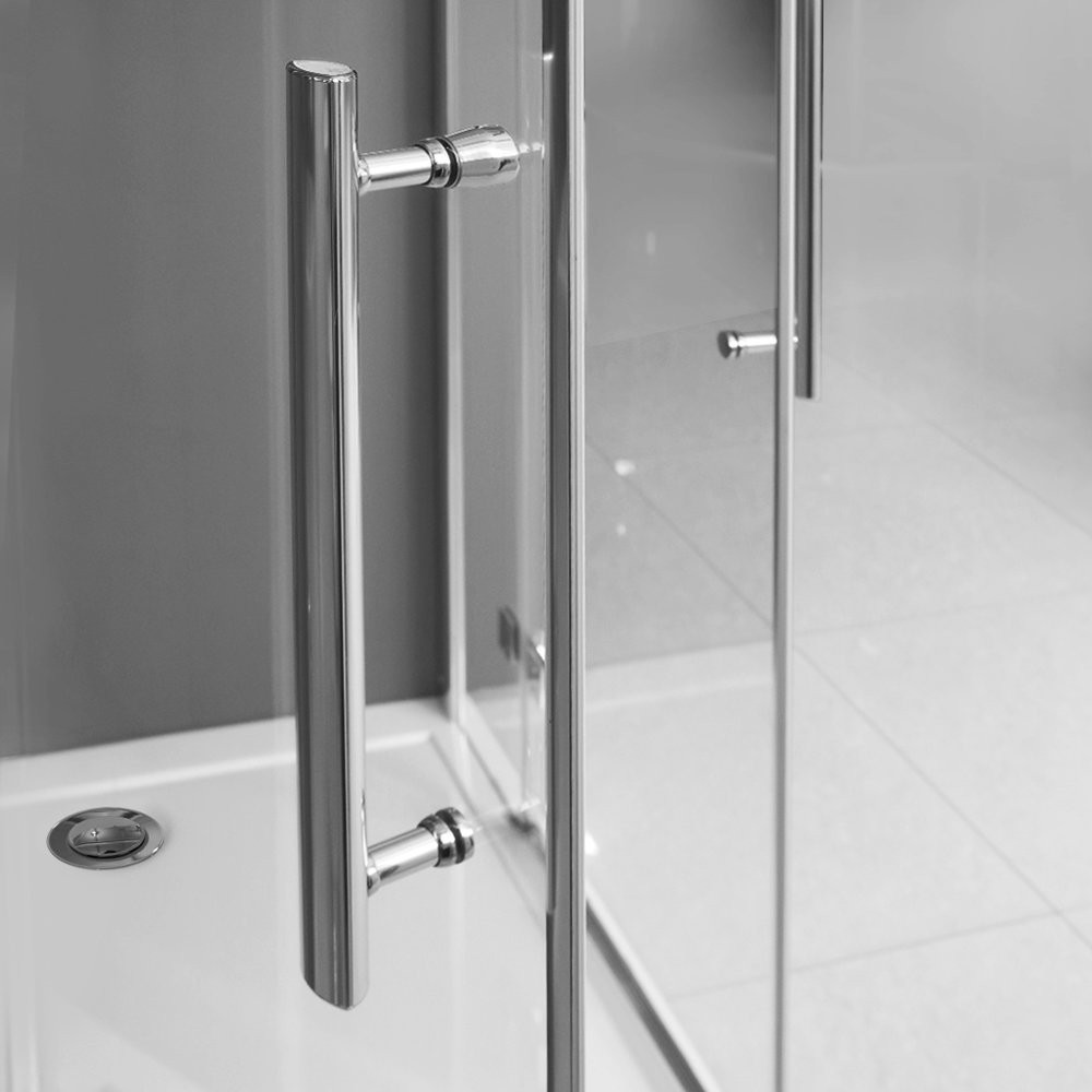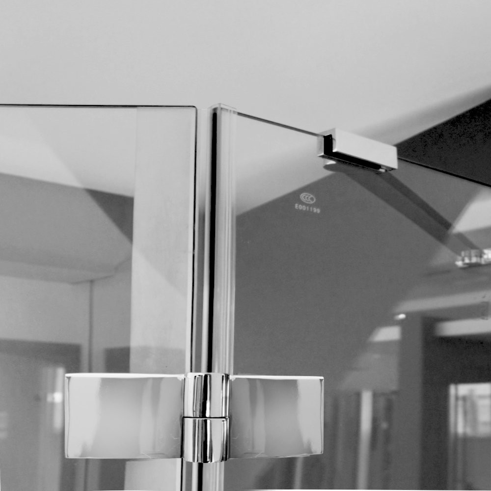Sprchový kout čtvercový s dvěma otevíracími dveřmi na panty. Jednoduchost pantů harmonicky kontrastuje s masivním chromovým madlem, které dotvářejí celkový dojem pevnosti a stabilty.