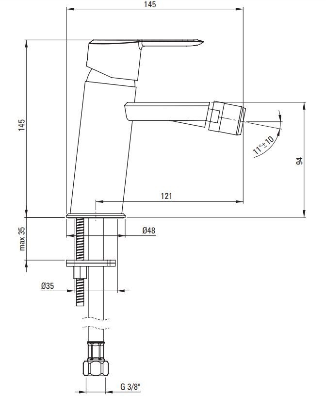 Páková bidetová baterie s pohyblivým zakončením výtoku je vyrobena z kvalitní mosazi a opatřena nejkvalitnější keramickou kartuší 35 mm. Dosah výtoku u této baterie je 121 mm, výška baterie je 145 mm a výška výtoku je 94 mm