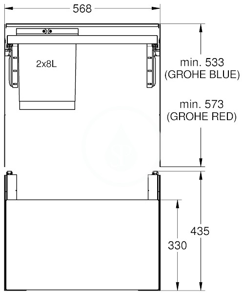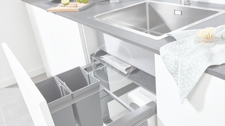 Tyto odpadkové koše jsou vhodné jak pro otevírací, tak výsuvná dvířka kuchyňské linky a jsou určeny k instalaci pod dřez. Podstatnou vlastností je fakt, že zohledňují rozměry chladiče, respektive bojleru kuchyňských systémů GROHE Blue a GROHE Red. Díky vestavným odpadkovým košům zůstane pracovní prostor kolem kuchyňského dřezu zcela nenarušený a nabídne maximální pohodlí pro každodenní život v kuchyni. Koše jsou k dispozici pro kuchyňské linky o šířce 60 nebo 90 cm a ve variantách s jednou, dvěma nebo třemi přihrádkami na recyklaci. V závislosti na šířce linky jsou k dispozici koše s kapacitou 16 až 40 litrů odpadu.