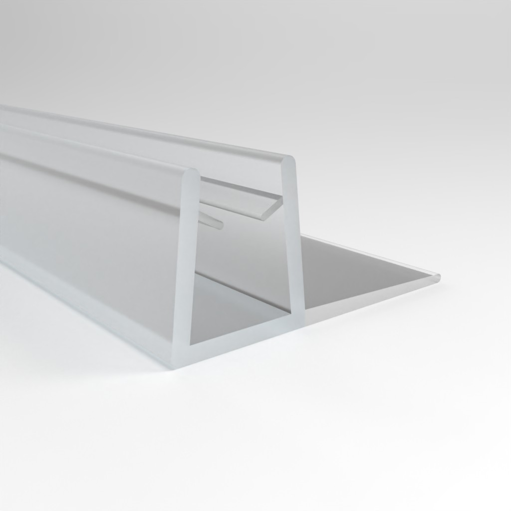 Tento silikonový těsnící profil slouží k utěsnění přechodu mezi sklem posuvných dveří a pevným bočním sklem. Těsnící lištu lze osadit i na sklo s menší tloušťkou, jen před vlastním osazením je třeba do drážky lišty aplikovat transparentní sanitární silikon, kterým se lišta přilepí na spodní hranu skla.