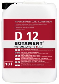BOTAMENT® D 12 je speciální základní nátěr pro zpevňování suchých, porézních cementových podkladů ve vnitřním i vnějším prostředí. Produkt se rovněž hodí pro ošetření silně nasákavých podkladů před omítáním.