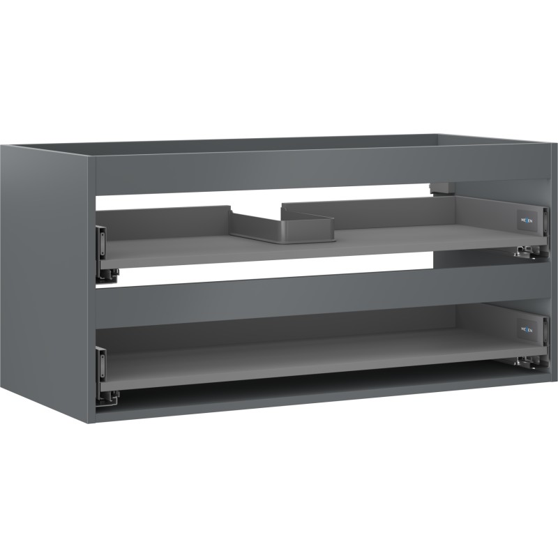 Specifikace produktu: Šířka: 100 cm Hloubka: 44,2 cm Výška: 47 cm Barva: Matný grafit Typ: Závěsné Materiál: Lakovaná deska Počet zásuvek: 2 Vodítka s funkcí tlumeného dovírání Plný výsuv pro snadný přístup k obsahu zásuvky Povrch odolný vůči UV záření Kombinovatelný s dvířky ze série Orio, Rivel Produkt smontovaný