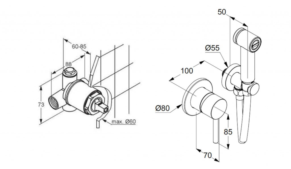 Páková podomítková baterie s bidetovou sprškou, včetně podomítkového tělesa