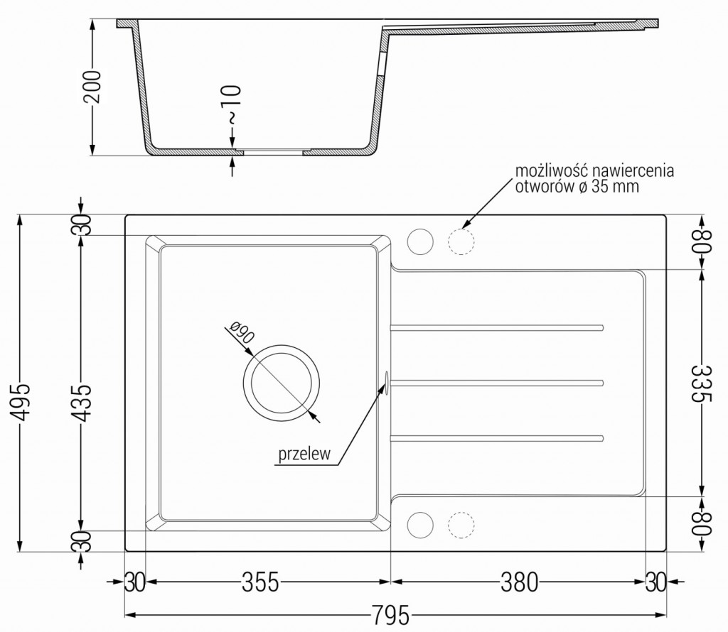 - odtokový otvor: 3,5 ”; fi = 90 mm