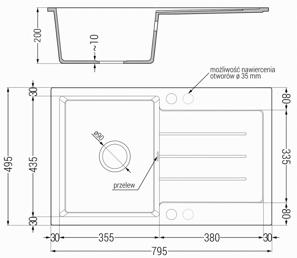 - odtokový otvor: 3,5 ”; fi = 90 mm
