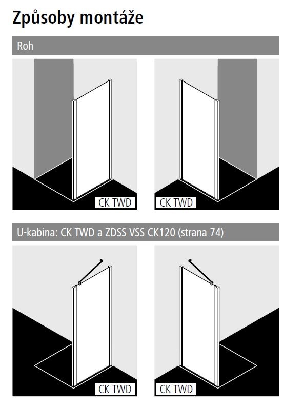 | Instalace | pro kombinaci se všemi Cada XS dveřmi v rohu, v rovině a pro U-kabinu (kromě CK 1KR/L a CK 1NR/L |