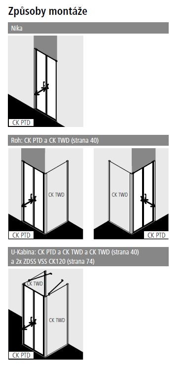 - Sprchové kyvné jsou určeny k montáži do niky a pro kombinaci s boční stěnou CK TWD.