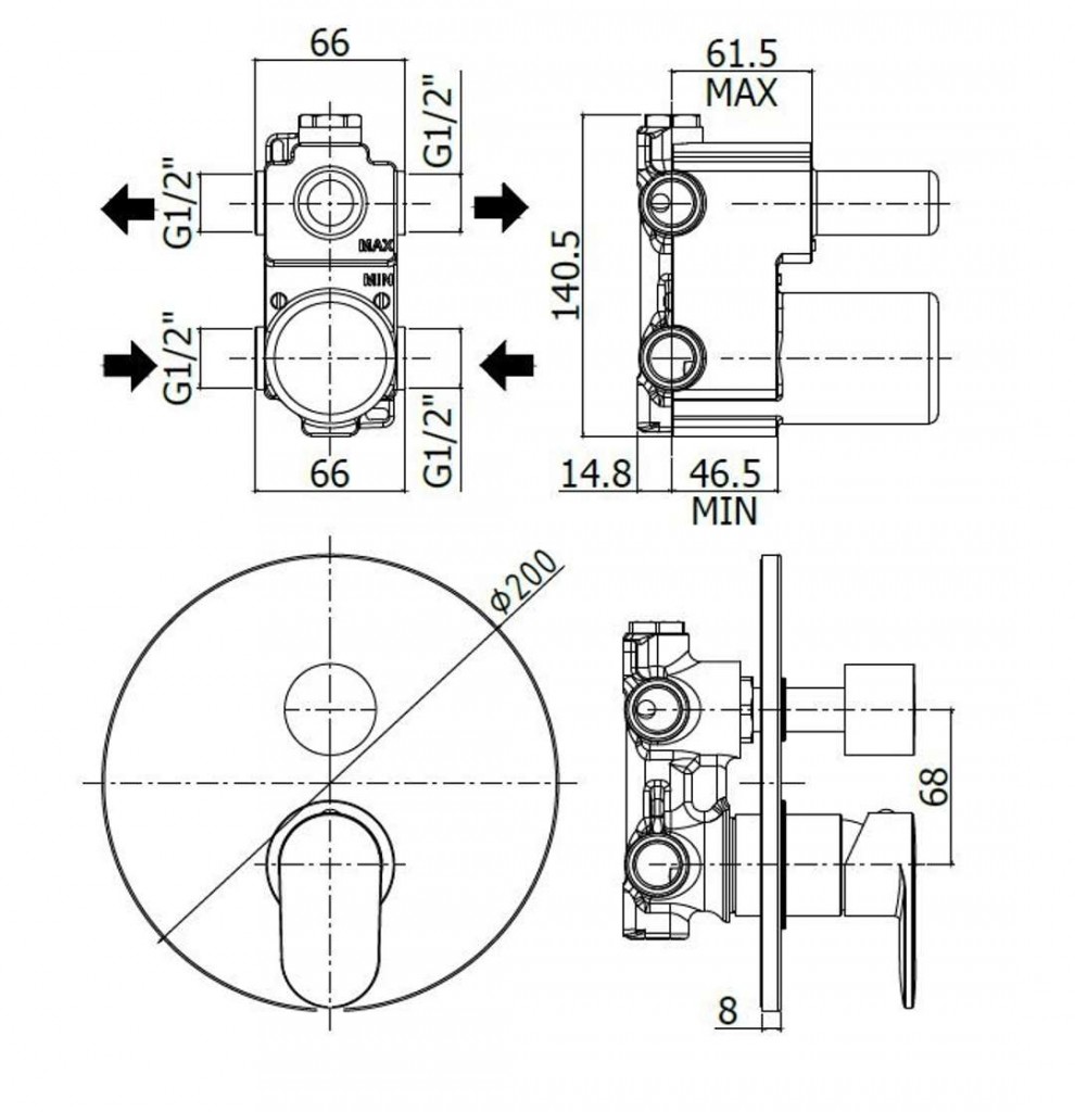 Sprchová páková baterie s otočným přepínačem včetně podomítkového tělesa pro 2 vývody