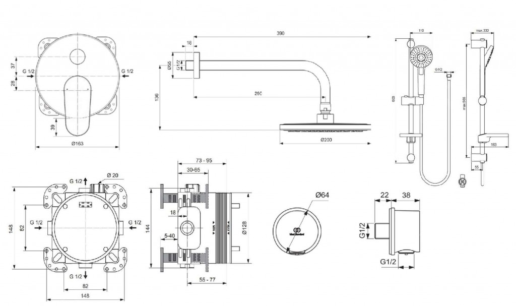 - sprchová tyč Idealrain - délka 603 mm, rozteč uchycení max. 565 mm