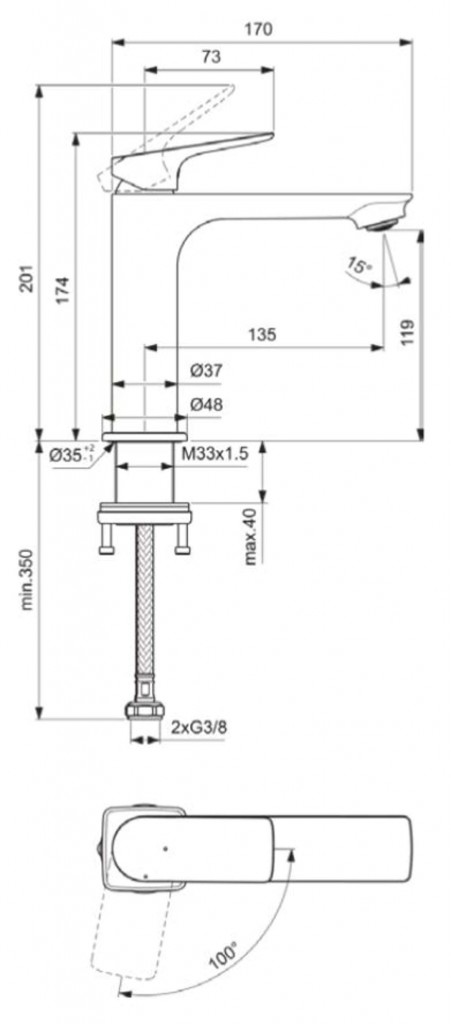 - BlueStart - ovládací páka je ve středové poloze a teče pouze studená voda, otáčením doleva přidáváme teplou vodu