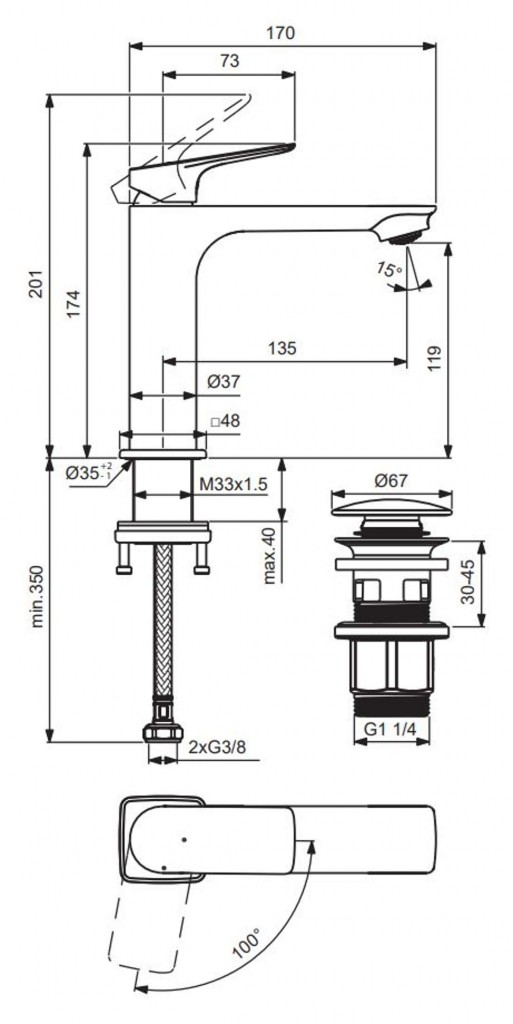 - BlueStart - ovládací páka je ve středové poloze a teče pouze studená voda, otáčením doleva přidáváme teplou vodu