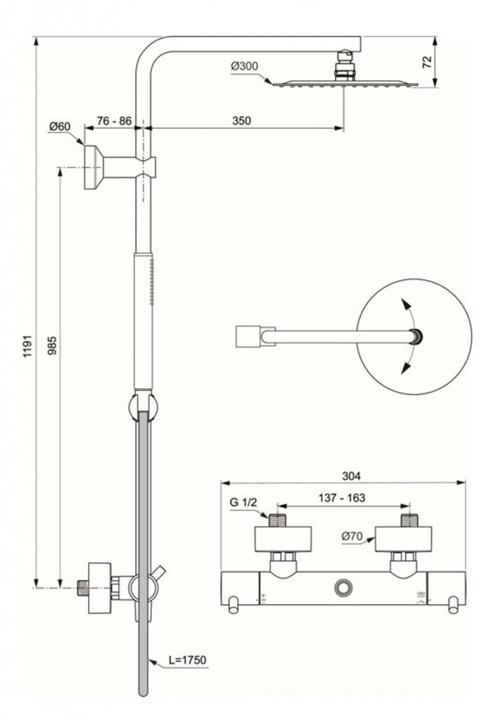 sprchovou hadici Idealflex 1750 mm, sprchovou tyč a držák sprchy