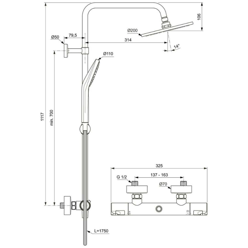 - průměr horní sprchy: 200 mm