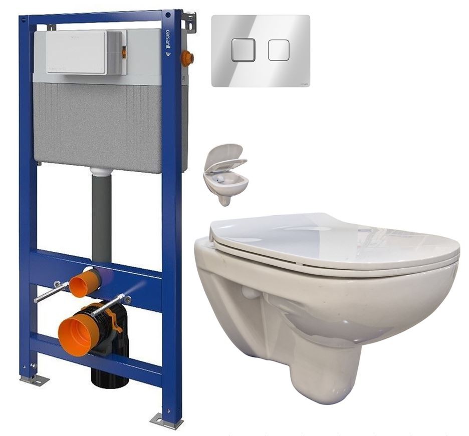 CERSANIT POD. SYSTÉM AQUA 52 PNEU S QF + TLAČÍTKO SQUARE CHROM + WC bez oplachového kruhu Edge + SEDÁTKO (S97-062 SQCR EG1)