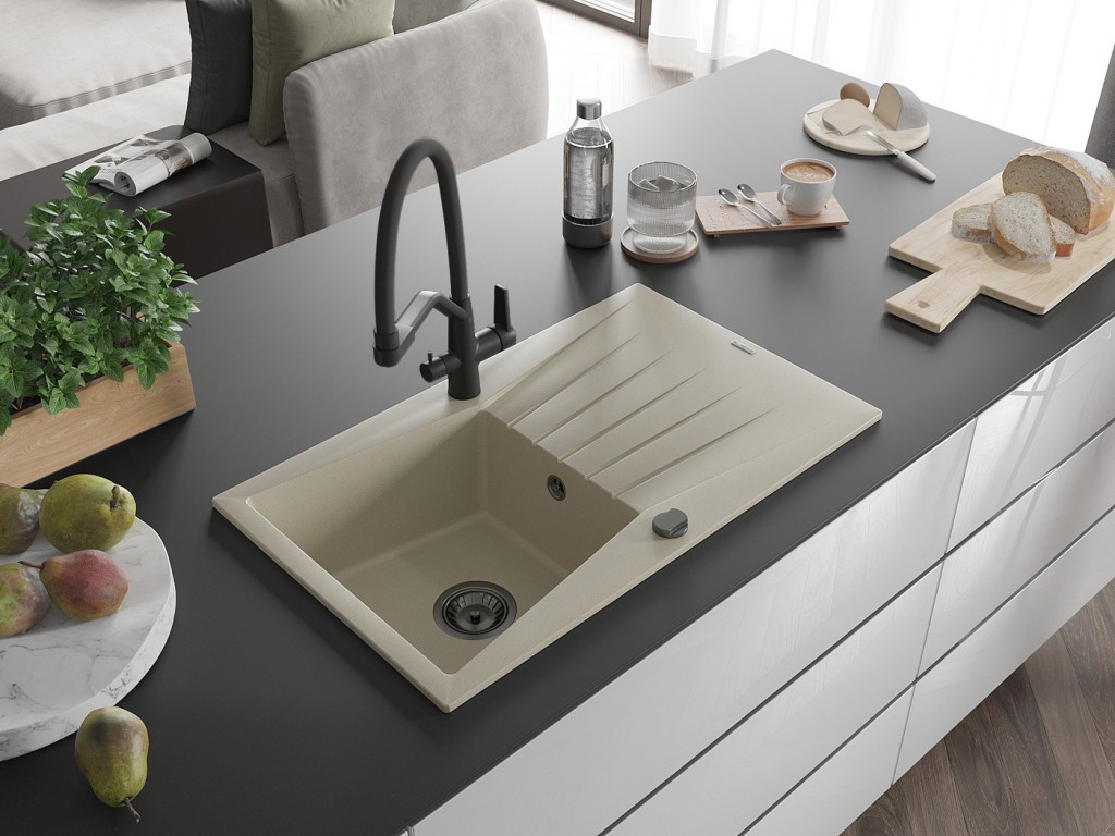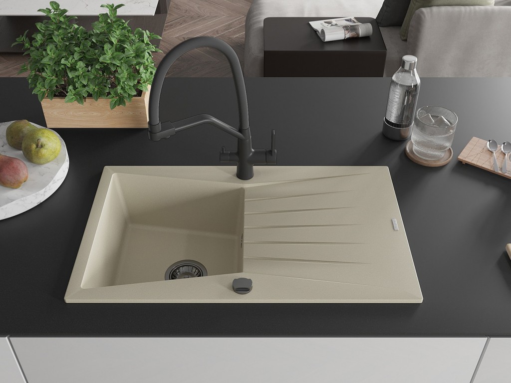 Speciální složení materiálu použitého pro výrobu je žula (80% žula – kámen, 20% pryskyřice) a jeho vysoká hustota garantuje bezpečné používání výrobku, a proto jsou granitové dřezy tak oblíbené. Díky povrchové úpravě nejsou na granitovém dřezu vidět zaschlé kapky, je odolný vůči skvrnám a neztrácí barvu. Povrch je odolný vůči nárazu, poškrábání, změně barvy, vysoké teplotě a teplotním šokům. Při jejich údržbě se používají obvyklé čistící, prostředky nebo prostředky na nádobí s jemným abrasivem. Výhodou je rozmanitá barevná nabídka.