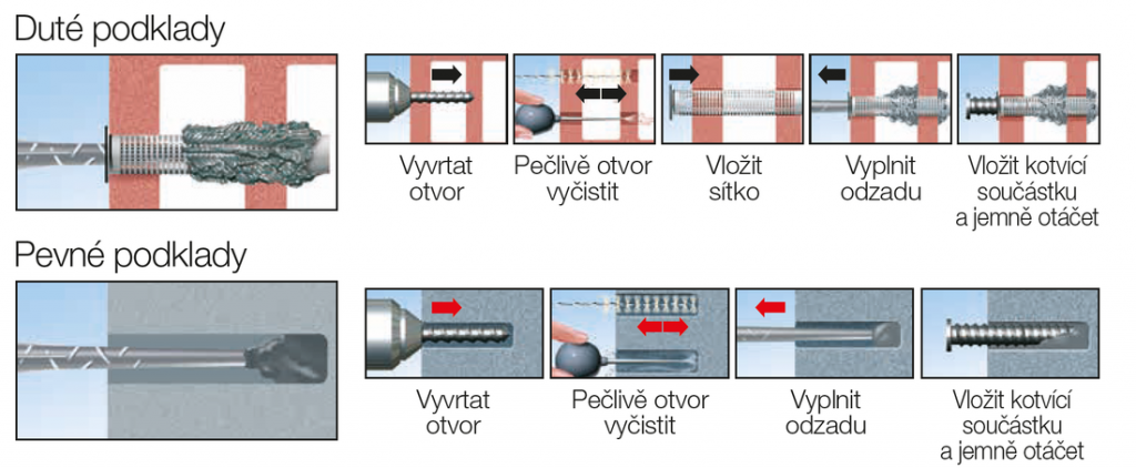 Návod na použití na duté materiály (cihly, příčky, zdi nebo na truhlářská okna a dveře):