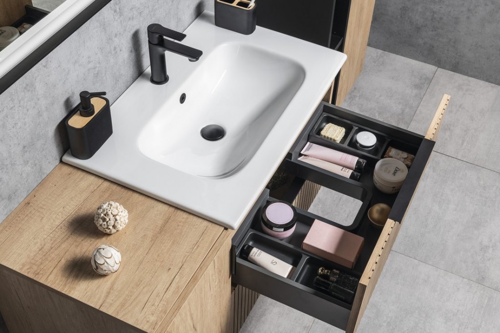 Velkou výhodou je možnost objednání praktických organizérů a misek LINDO pro uložení předmětů každodenní potřeby do horní i spodní zásuvky. Zásuvky jsou vybaveny výsuvy s pomalým dojezdem a automatickým dovřením, dvířka mají kování s tlumeným dovíráním. Úložný prostor lze rozšířit přidáním doplňkových skříněk ESPACE.