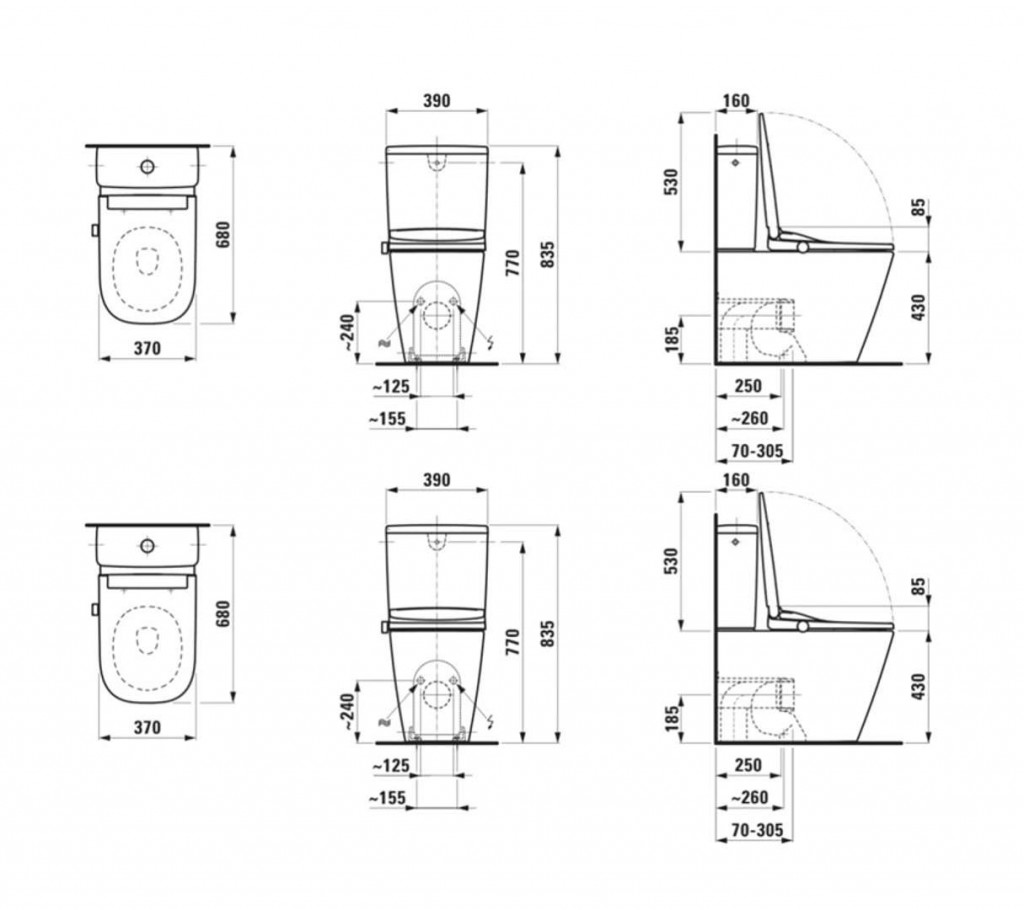 - 2 otvory pro připojení vody a elektřiny, vlevo a vpravo, pro sedátko SIT