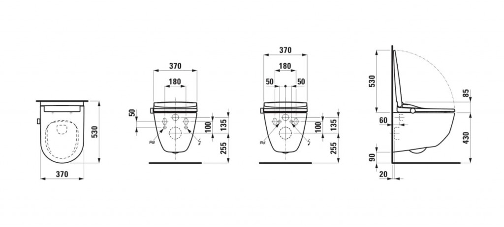 - 2 otvory pro připojení vody a elektřiny, vlevo a vpravo, pro sedátko SIT