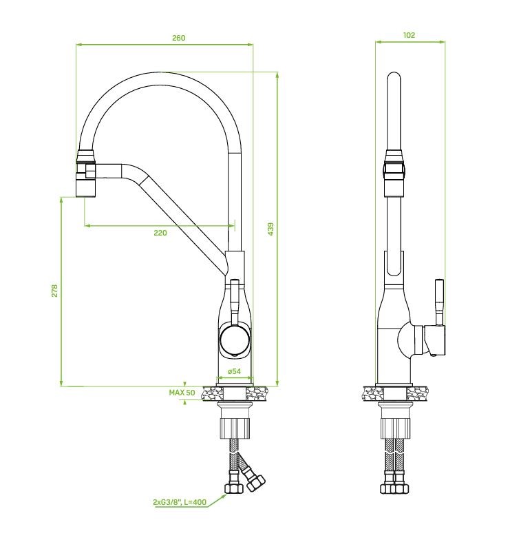 Baterie Colina nabízí možnost přepínání mezi klasickým a sprchovým proudem vody, což zajišťuje maximální funkčnost při každodenním používání. Klasický proud je ideální pro napouštění nádob nebo běžné mytí, zatímco sprchový režim umožňuje rychle a efektivně opláchnout ovoce, zeleninu nebo nádobí. Tato praktická funkce zvyšuje komfort práce v kuchyni a přizpůsobí se aktuálním potřebám.