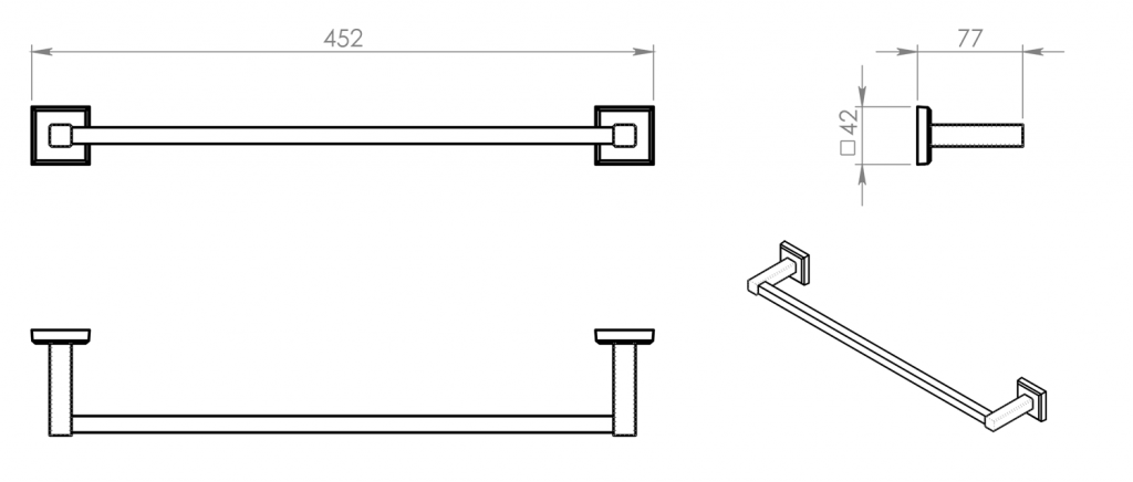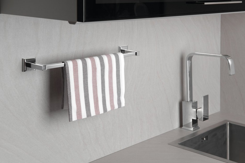Malý hranatý úchyt na stěnu a štíhlé hranaté profily charakterizují sérii COLORADO. Doplňky lze na stěnu přivrtat nebo nalepit.