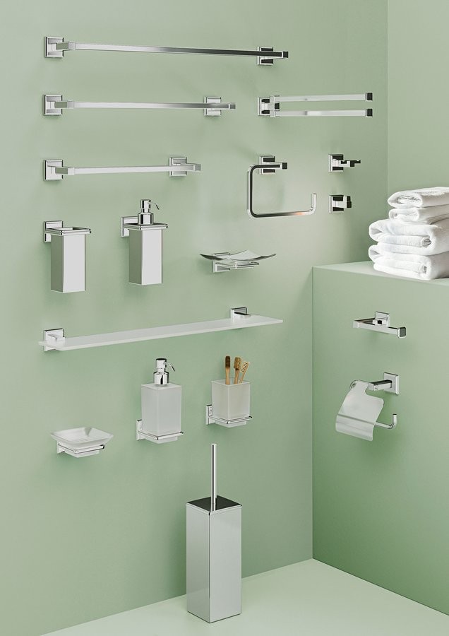 Malý hranatý úchyt na stěnu a štíhlé hranaté profily charakterizují sérii COLORADO. Doplňky lze na stěnu přivrtat nebo nalepit.