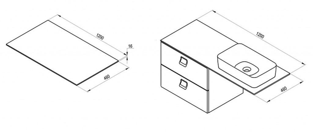 Pokud je deska umístěna na závěsnou skříňku z jedné strany, je nutné z druhé strany desku podepřít pomocí konzole desky Balance/Comfort 1200.