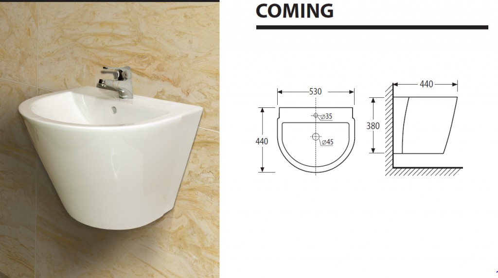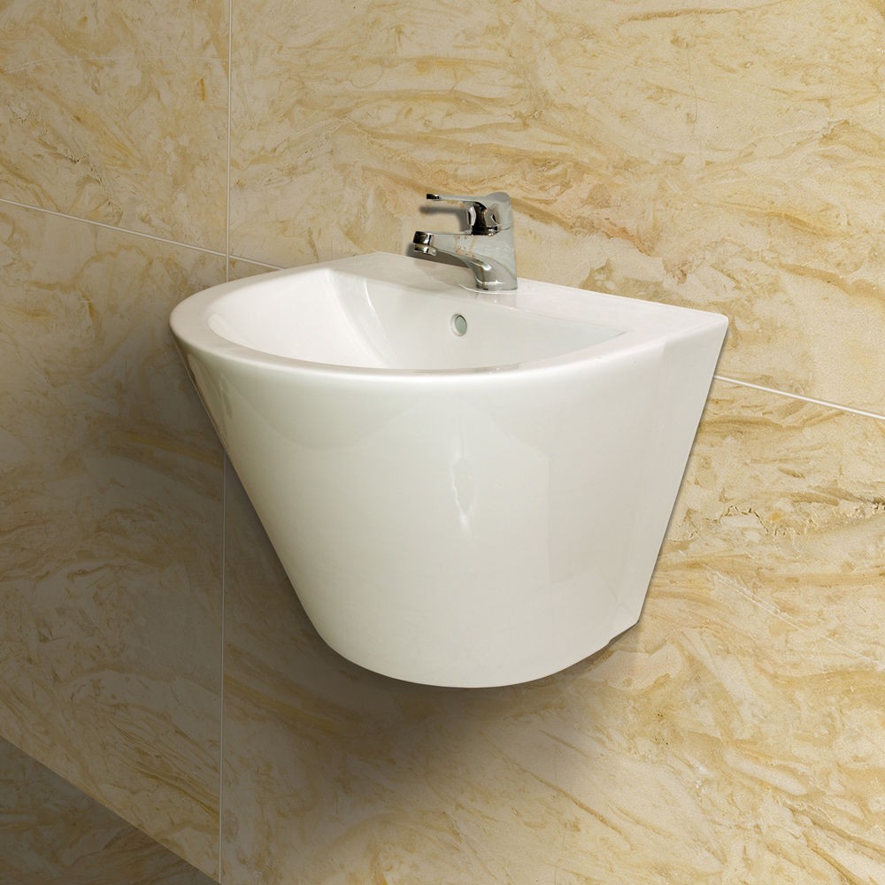 Závěsné keramické umyvadlo s otvorem pro baterii, včetně montážní sady.