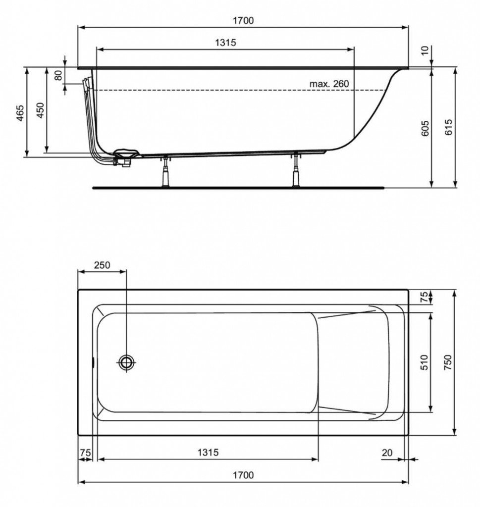 Nožičky a odtoková souprava nejsou součástí dodávky.
