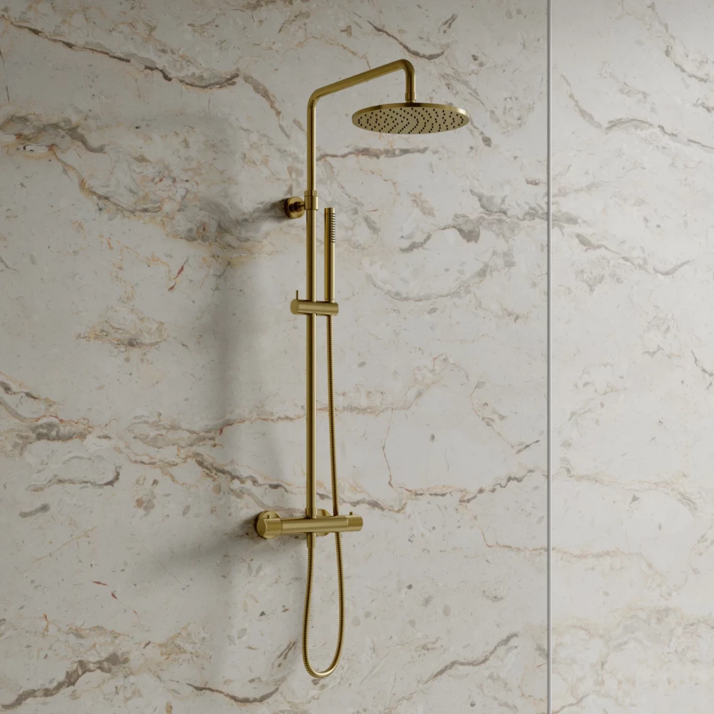 Sprchový sloup CONTOUR s nástěnnou sprchovou termostatickou baterií je dostupný v barevných variantách chrom, kartáčovaná měď, zlato a antracit. Baterie je vybavena nejkvalitnější termostatickou kartuší se zámkem 38°C. Kartuše chrání před náhlými změnami teploty a zaručuje pohodlné používání baterie po léta. Dešťová sprcha byla vytvořena pomocí technologie ANTI-SCALE /vnitřek je lemován silikonovým povlakem, který zabraňuje hromadění vody/.
