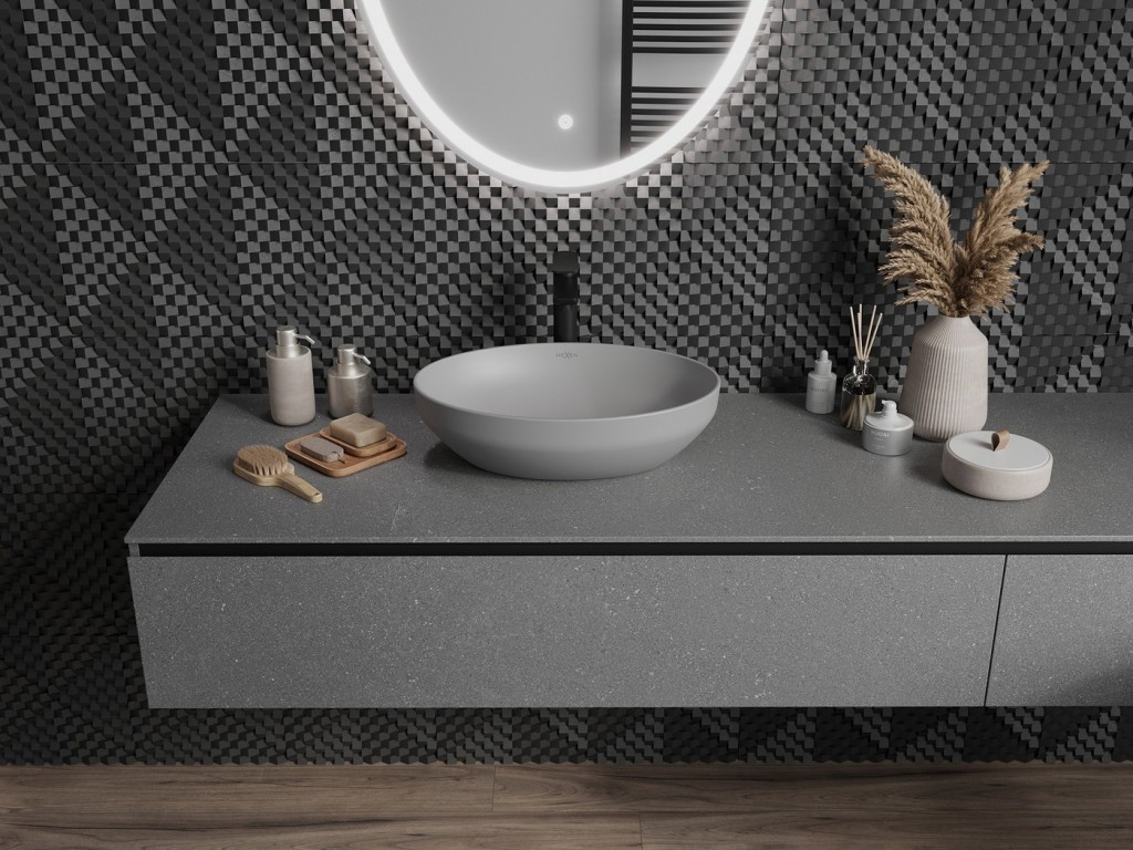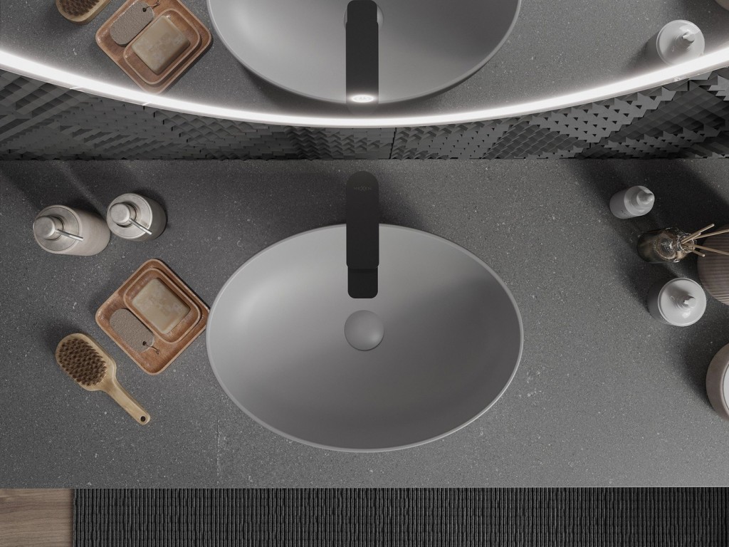 Samotné umyvadlo na desku je dlouhé 50 cm a hluboké 37 cm, což vybízí k tomu, že je možnost umístění dvou umyvadel vedle sebe /pokud vám prostor dovolí/. Umyvadlo nemá bezpečnostní přepad ani otvor pro baterii. Proto k němu vybírejte vysokou umyvadlovou baterii nebo podomítkovou umyvadlovou baterii. Vždy se snažte vybírat takovou, aby ústí kohoutku směřovalo doprostřed umyvadla. Jedině tak zabráníte nechtěnému rozstřikování vody a zároveň budete mít dostatek prostoru pro mytí rukou.