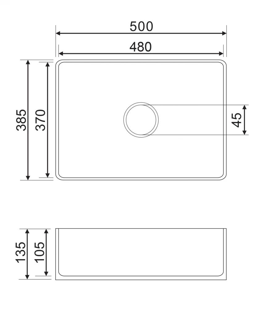 Na šířku má 50 cm a je 38,5 cm hluboké. Na výšku má 13,5 cm, což vám dává možnost vybírat z velkého množství baterií na desku. Při výběru vysoké stojánkové baterie pořiďte takovou baterii, která bude proud vody směřovat přímo do středu umyvadla. Tím zabráníte nechtěnému rozstřikování vody do okolí. Chybu neuděláte, ani když pořídíte vhodnou podomítkovou baterii. Umyvadlo má standardní průměr odtoku 45 mm a nemá bezpečnostní přepad. Výpust není součástí umyvadla, vhodnou bez přepadu můžete vybrat zde.