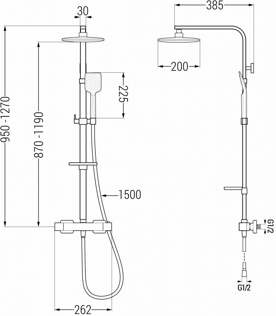- připojení sprchy: G 3/4 "(nahoře) a G 1/2" (dole)