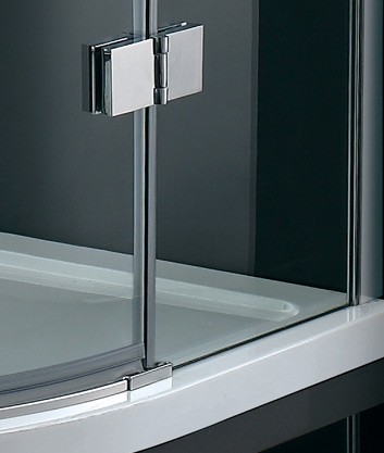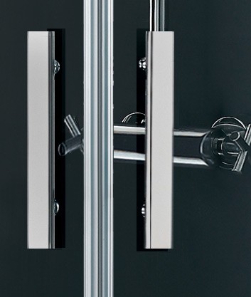 Sprchový kout obloukový se dvěma otevíracími dveřmi na masivních chromových pantech, s upevňovacími hranatými kovovými konzolami a výjimečným provedením velké a nádherně ladící úchytky.