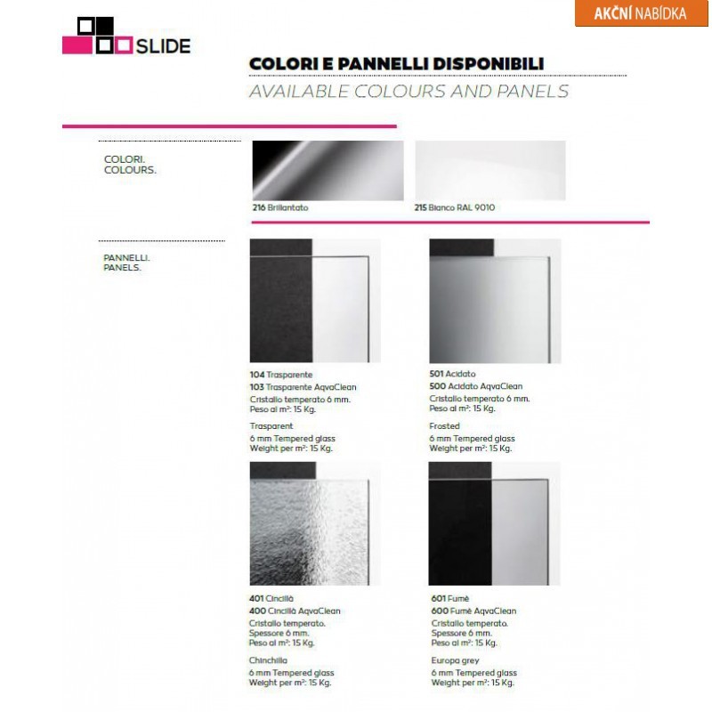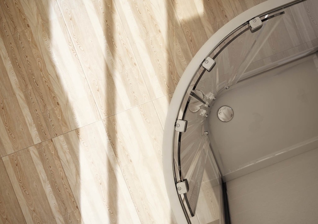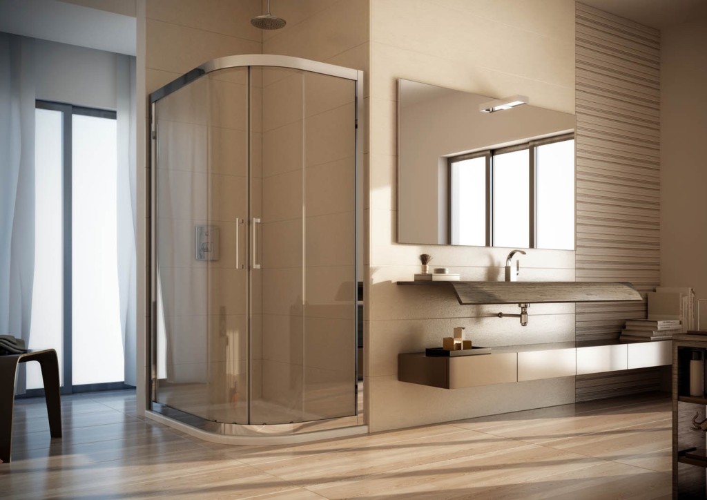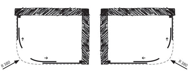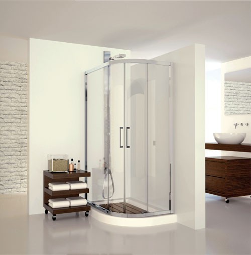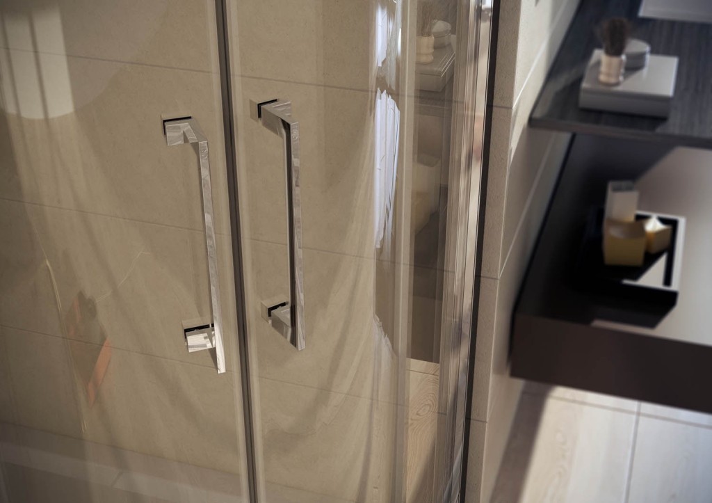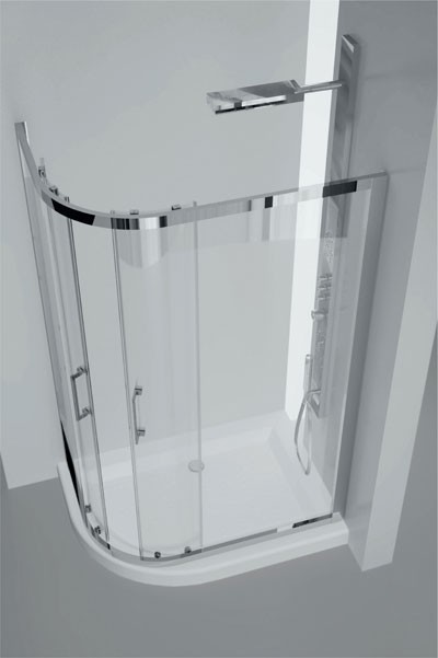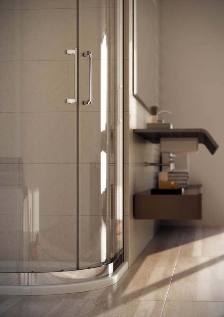 Sprchový kout s čtvrtkruhovým atypickým tvarem s pevným rámem a dvojdílnými posuvnými dveřmi s nadstandardní šířkou vstupu. Atypický tvar nezmenšuje koupelnu svým vyčníváním. Se svou výškou 190 cm lze kout instalovat i bez sprchovací vaničky přímo na dlažbu.