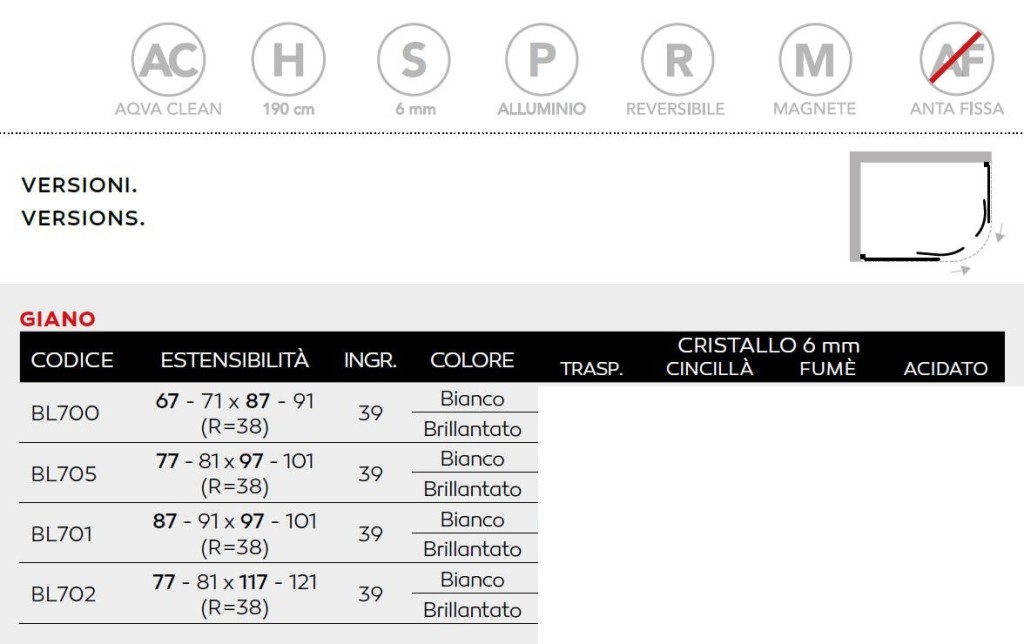 Sprchový kout GIANO s atypickým tvarem pro chytré řešení vaší koupelny. Čtvrtkruhové sprchové kouty s tímto tvarem nabízí atraktivní vnitřní prostor a svou konstrukcí nevyčnívají do prostoru. Jedinečné rozměry 70 × 90 cm a 90 × 100 cm jsou určeny pro nejmenší koupelny. Klasický rozměr 80 × 120 cm nabízí solidní sprchovací prostor pro dva. Moderní rám z leštěného hliníku a výplň z 6 mm skla.