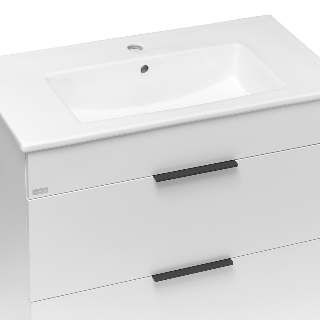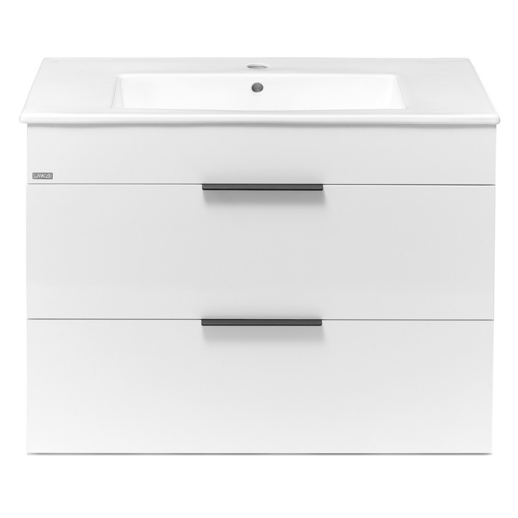 Jika Cube vzniká ze současných trendů: čistý, geometrický vzhled nábytku i výrazného umyvadla s hladkou odkládací plochou. Umyvadlové skříňky jsou dostupné ve dvou barevných provedeních, bíle lakované či v elegantním dekoru tmavý dub. Skříňky lze objednat s plnovýsuvnými zásuvkami nebo s dvířky (u vybraných vzorů).