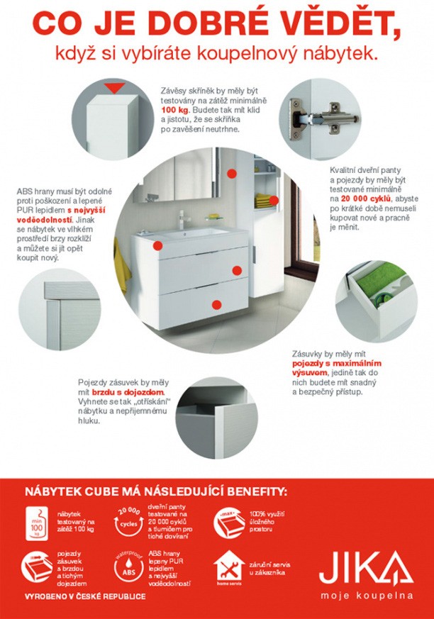 Nábytek Jika se kromě příznivé ceny charakterizuje vysokou odolností proti vlhkosti i mechanickému poškození. K jeho zhotovování se používají jen ta nejkvalitnější lepidla. ABS hrany o tloušťce 2 a 0,8 mm jsou z materiálu s vysokou odolností proti mechanickému poškození. Používá se nábytkové kování od vyhlášených firem, např. od společnosti Hettich, které je osazeno zpomalovači dovírání. Testují se ve spojení s nábytkem na 20 000 cyklů otevření a zavření. Také závěsné kování je testováno na dodatečnou zátěž 100 kg. Díky značné hustotě dřevotřískové desky (např. výrobce Egger), ze které jsou zhotoveny korpusy, je materiál pevnější v ohybu a v uchycení vrutů. Navíc má minimální emise formaldehydu – emisní třída E1 – E1/2. Povrchy dřevotřískových desek jsou opatřeny laminovou fólií o gramáži 100 g/m2. Na čílka zásuvek a skříněk, např. u nábytku Cubito, používáme MDF s vysoce lesklým 5vrstvým PUR lakem. Vzhled lakované plochy se nemění, nestárne, nežloutne, neboť obsahuje UV filtry.