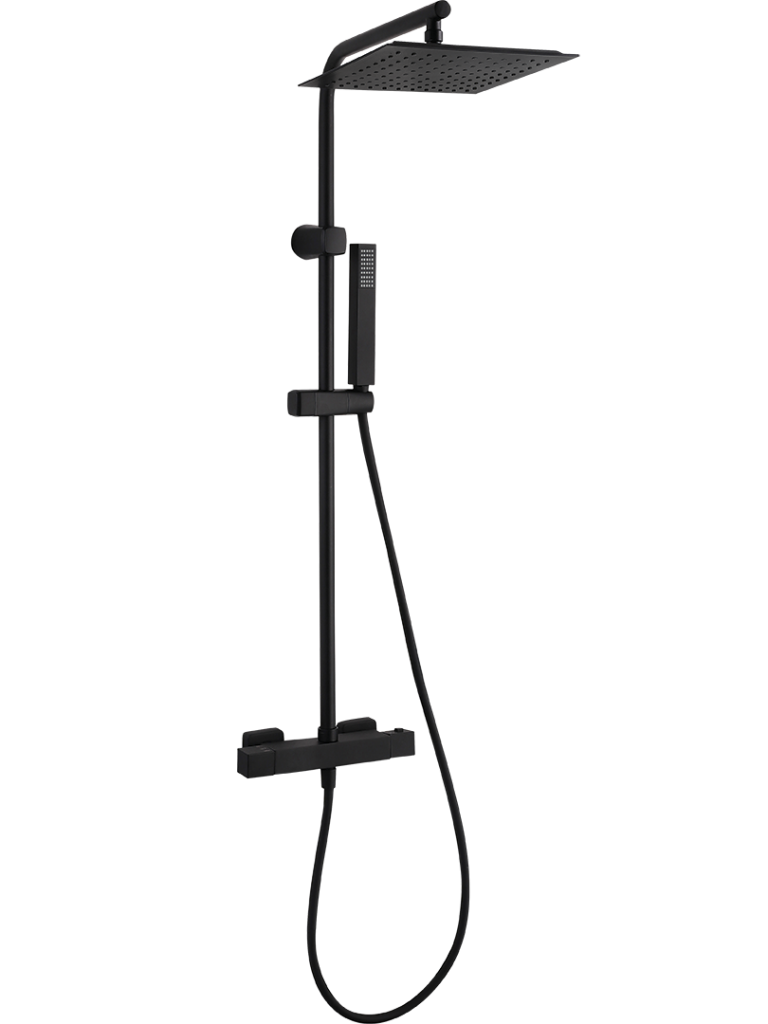 Kubistický tvar a matná černá barva jsou charakteristickými znaky sprchového sloupu Cubi. Tento produkt je určen pro moderní interiéry, zejména ty v industriálním stylu. Sloup je vybaven širokou dešťovou sprchovou hlavicí o rozměrech 25x25 cm a termostatickou směšovací baterií, která umožňuje konstantní teplotu vody pro pohodlné sprchování, což je důležité zejména pro děti a starší osoby. Hadice s ochranou proti přetočení zabraňuje nechtěnému kroucení sprchy během používání. Systém proti usazování vodního kamene usnadňuje odstraňování vodního kamene z vody a jeho usazování na sprchové hlavici a ruční sprchové rukojeti.