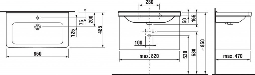 - rozměry šířka 850 mm, hloubka 485 mm, výška 165 mm