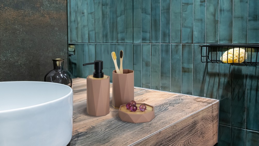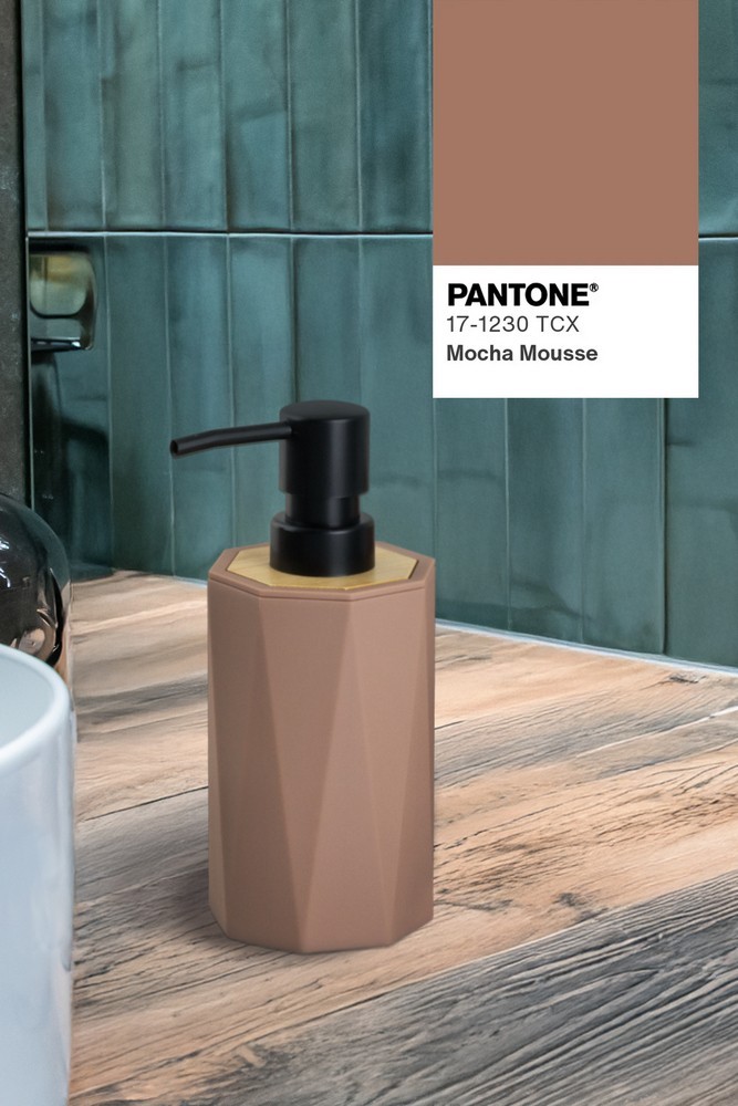 Dávkovač mýdla AWD INTERIOR 2000 Mokato (360 ml) je odolný a funkční prvek koupelnové kolekce Mokato. Vyroben z vysoce kvalitního ABS plastu s akcenty z přírodního bambusového dřeva. Povrchová úprava v barvě roku 2025 od Pantone – Mocha Mousse, jemné, syté hnědé inspirované zemitými tóny, jako je káva a čokoláda. Pantone ji popisuje jako „sugestivní, jemnou hnědou prodchnutou smyslným a uklidňujícím teplem“. Ideální pro koupelny v japonském, ekologickém a moderním stylu. V sérii je dále: sklenka na postavení, mýdlenka a WC štětka.