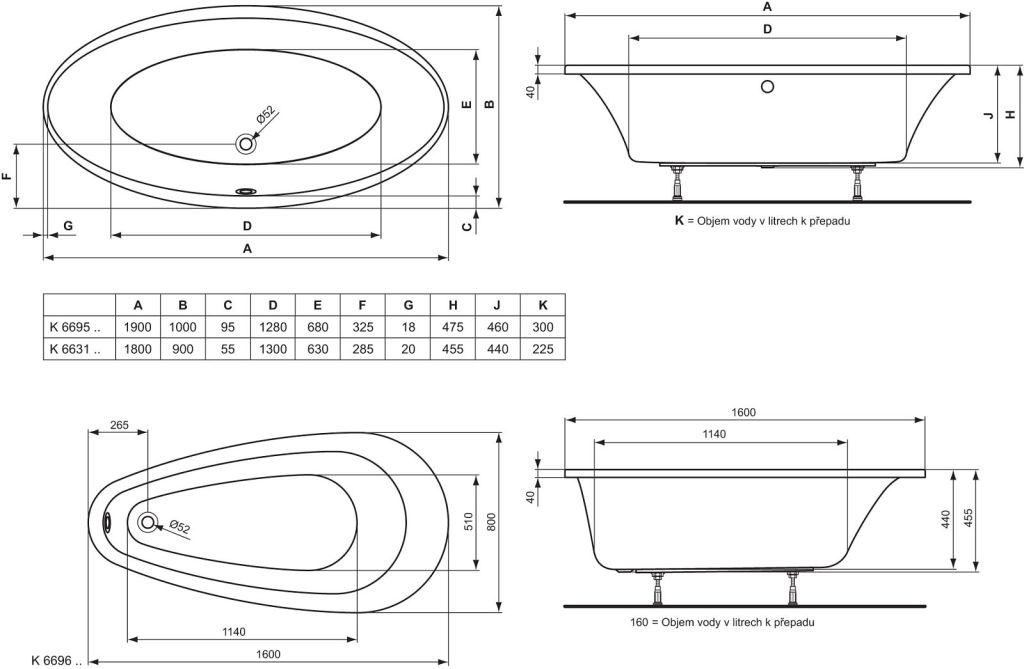 Upozornění pro vanu 1900 x 1000 mm! Vzhledem k neobvyklé hloubce vany je nutné použít odtokovou a přepadovou garnituru s prodloužením!