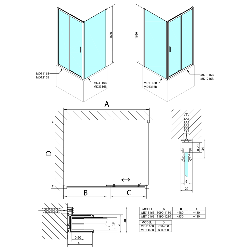 - Snadná montáž, tolerance 20 mm nastavením skel v profilu
