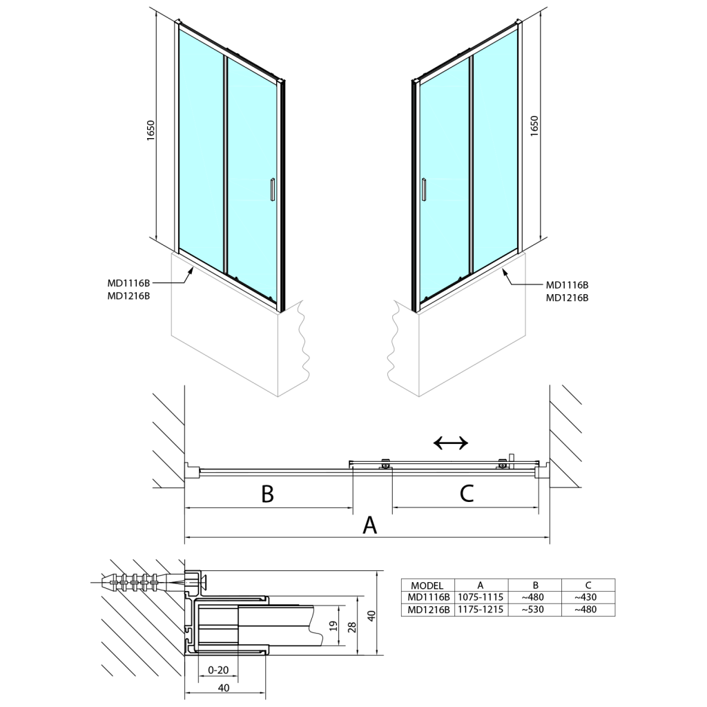 - Snadná montáž, tolerance 20 mm nastavením skel v profilu