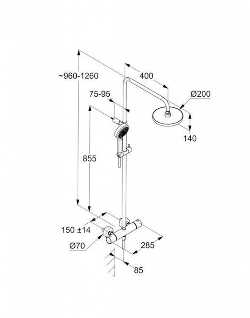 - sprchová tyč s výškově nastavitelným ramenem: 960 - 1260 mm