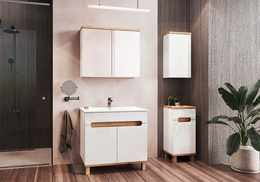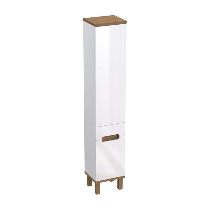 | Popis: | • doplňková koupelnová skříňka vysoká • moderní kombinace bílých lakovaných ploch a doplňků v dekoru zlatý dub • 2 x dvířka s tichým dovíráním Soft-Close s frézovanými madly a možností změny směru otevírání • 1 x zásuvka s tichým dovíráním Soft-Close • uvnitř skříňky jsou umístěny 3 výškově nastavitelná police z LTD bílé barvy (2 police v horní a 1 police ve spodní části skříňky) • skříňka je doplněna horní deskou tloušťky 25 mm v dekoru zlatý dub • k ustavení na podlahu slouží podpěrné nožky z MDF s povrchovou úpravou fólií v dekoru zlatý dub |